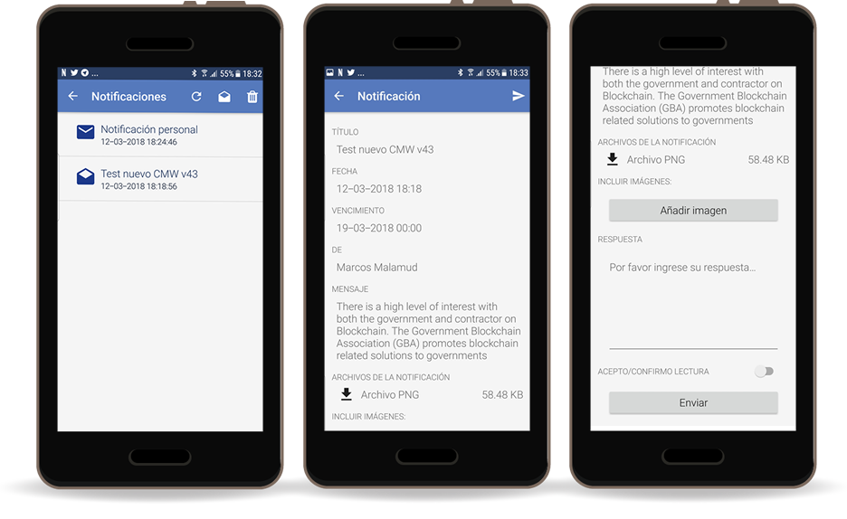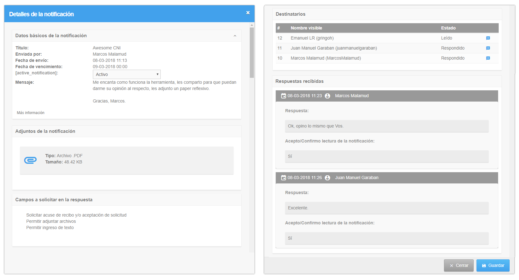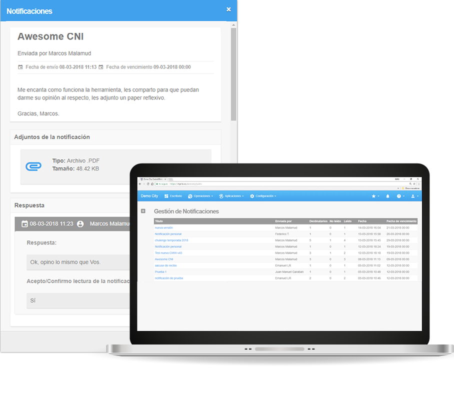 Estas notificaciones permiten al emisor fijar reglas, como obligar a marcar leído al receptor, o solicitarle escribir una respuesta o adjunto. Asimismo al emisor le permite ver las respuestas al mismo y el estado de lectura y respuesta a cada notificación. En caso de que el receptor no conteste, la misma se vence y lo indica al emisor, así como permite mandar un mensaje rápido relacionado de manera ya personalizada.